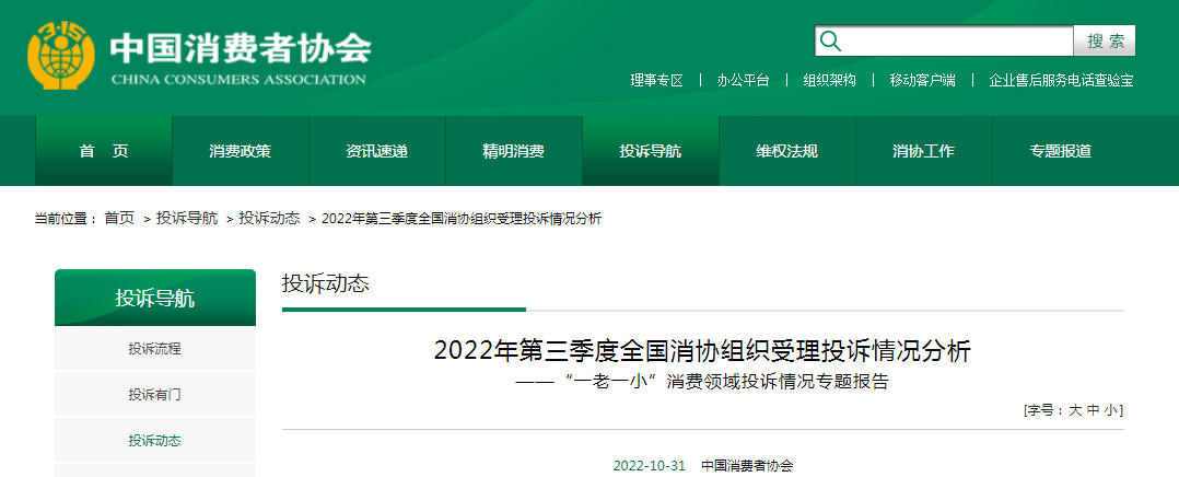 中國質(zhì)量新聞網(wǎng)訊 據(jù)中國消費(fèi)者協(xié)會網(wǎng)站10月31日消息,為強(qiáng)化老年人和未成年人等特殊消費(fèi)群體保護(hù)力度,促進(jìn)實(shí)現(xiàn)更大范圍消費(fèi)公平,推動相關(guān)領(lǐng)域消費(fèi)潛力的進(jìn)一步釋放,中消協(xié)梳理全國消協(xié)組織受理有關(guān)老年人和未成年人消費(fèi)投訴和咨詢案例,形成“一老一小”消費(fèi)領(lǐng)域投訴情況專題報(bào)告并發(fā)布關(guān)于加強(qiáng)“一老一小”領(lǐng)域消費(fèi)者權(quán)益保護(hù)的意見。