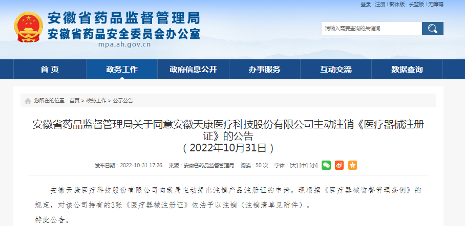中國質量新聞網(wǎng)訊 10月31日,安徽省藥品監(jiān)督管理局網(wǎng)站發(fā)布公告稱,安徽天康醫(yī)療科技股份有限公司向該局主動提出注銷產品注冊證的申請。現(xiàn)根據(jù)《醫(yī)療器械監(jiān)督管理條例》的規(guī)定,對該公司持有的3張《醫(yī)療器械注冊證》依法予以注銷。