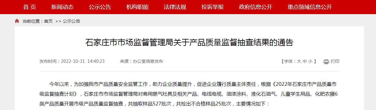 不合格樣品檢出批次等數據僅反映此次抽查涉及樣品的情況,不作為石家莊市市場此類產品質量狀況評價依據。對于監(jiān)督抽查中發(fā)現的問題,該局已移交相關縣(市、區(qū))市場監(jiān)管部門依法處理。