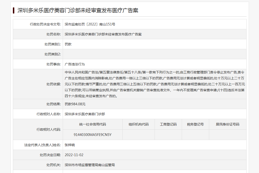 行政處罰信息還顯示,處罰決定日期為2022年11月2日。深圳多米樂醫(yī)療美容門診部法定代表人(負責(zé)人)為張梓曉。