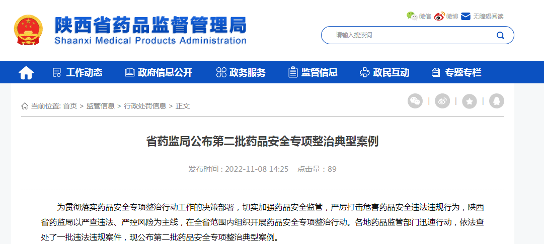 中國(guó)質(zhì)量新聞網(wǎng)訊 據(jù)陜西省藥監(jiān)局網(wǎng)站11月8日消息,為貫徹落實(shí)藥品安全專項(xiàng)整治行動(dòng)工作的決策部署,切實(shí)加強(qiáng)藥品安全監(jiān)管,嚴(yán)厲打擊危害藥品安全違法違規(guī)行為,陜西省藥監(jiān)局以嚴(yán)查違法、嚴(yán)控風(fēng)險(xiǎn)為主線,在全省范圍內(nèi)組織開展藥品安全專項(xiàng)整治行動(dòng)。各地藥品監(jiān)管部門迅速行動(dòng),依法查處了一批違法違規(guī)案件,現(xiàn)公布第二批藥品安全專項(xiàng)整治典型案例。