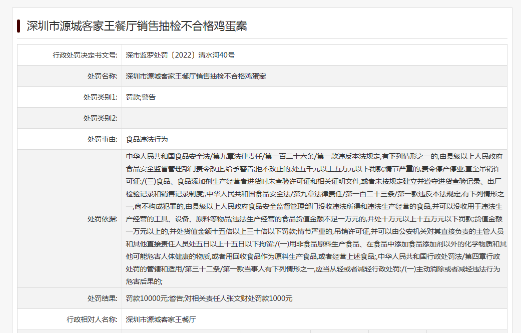 行政處罰信息還顯示,處罰決定日期為2022年11月2日。深圳市源城客家王餐廳法定代表人(負(fù)責(zé)人)為張漢強(qiáng)。