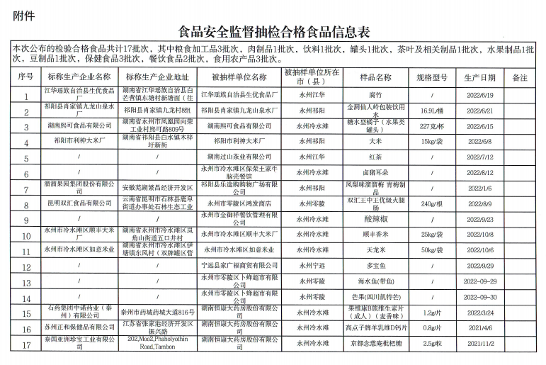 中國質(zhì)量新聞網(wǎng)訊 近日,湖南省永州市市場(chǎng)監(jiān)督管理局發(fā)布關(guān)于17批次食品安全監(jiān)督抽檢情況的通告(2022年第十五期)。本期該局對(duì)糧食加工品、肉制品、飲料、罐頭、茶葉及相關(guān)制品、水果制品、豆制品、保健食品、餐飲食品、食用農(nóng)產(chǎn)品等10大類17批次樣品開展了食品安全抽樣檢驗(yàn),根據(jù)食品相關(guān)標(biāo)準(zhǔn)檢驗(yàn)和判定,17批次樣品合格。