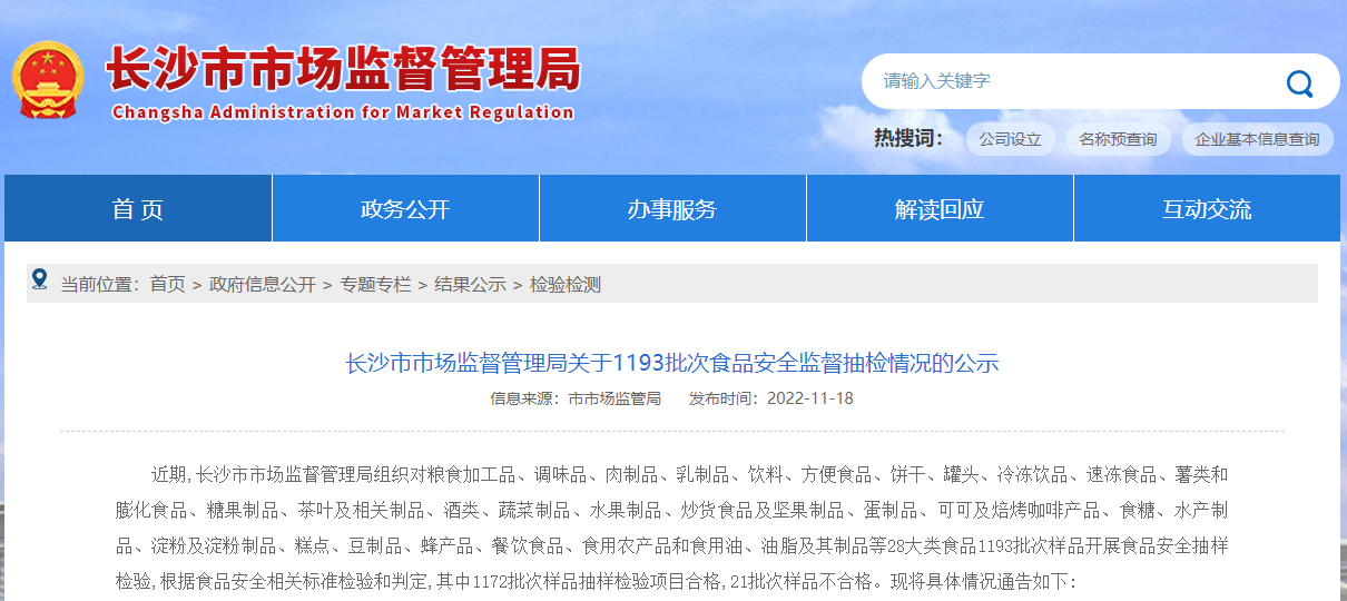 中國質(zhì)量新聞網(wǎng)訊 11月18日,長沙市市場監(jiān)督管理局網(wǎng)站公示1193批次食品安全監(jiān)督抽檢情況。本次該局對糧食加工品、調(diào)味品、肉制品、乳制品、飲料、方便食品、水產(chǎn)制品、淀粉及淀粉制品、糕點(diǎn)、豆制品、蜂產(chǎn)品、餐飲食品、食用農(nóng)產(chǎn)品和食用油、油脂及其制品等28大類食品1193批次樣品開展食品安全抽樣檢驗(yàn),根據(jù)食品安全相關(guān)標(biāo)準(zhǔn)檢驗(yàn)和判定,其中1172批次樣品抽樣檢驗(yàn)項(xiàng)目合格,21批次樣品不合格。具體情況如下: