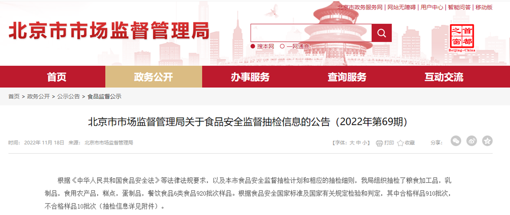 公告顯示,根據(jù)《中華人民共和國(guó)食品安全法》等法律法規(guī)要求,以及北京市食品安全監(jiān)督抽檢計(jì)劃和相應(yīng)的抽檢細(xì)則,北京市市場(chǎng)監(jiān)督管理局組織抽檢了糧食加工品,乳制品,食用農(nóng)產(chǎn)品,糕點(diǎn),蛋制品,餐飲食品6類食品920批次樣品。根據(jù)食品安全國(guó)家標(biāo)準(zhǔn)及國(guó)家有關(guān)規(guī)定檢驗(yàn)和判定,其中合格樣品910批次,不合格樣品10批次(抽檢信息詳見附件)。