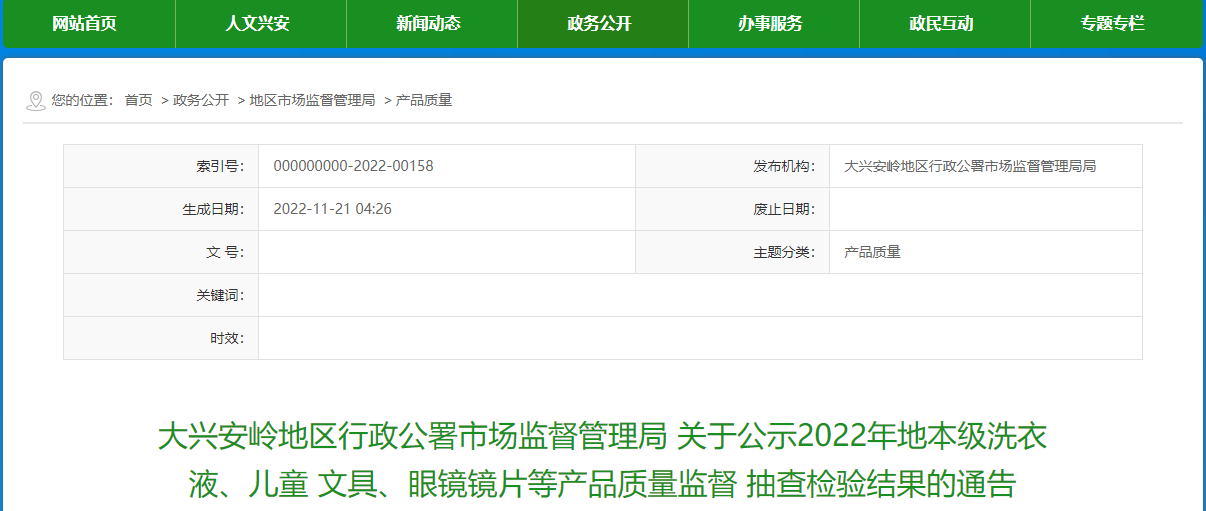 中國質(zhì)量新聞網(wǎng)訊 11月21日,黑龍江省大興安嶺地區(qū)行政公署市場監(jiān)管局公示2022年地本級洗衣液、兒童 文具、眼鏡鏡片等產(chǎn)品質(zhì)量監(jiān)督抽查檢驗(yàn)結(jié)果。其中,對8家眼鏡鏡片、鏡架經(jīng)銷企業(yè)的15批次產(chǎn)品進(jìn)行抽樣,合格產(chǎn)品14批次,不合格產(chǎn)品1批次。