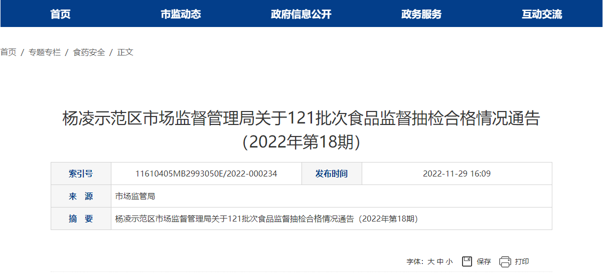 中國(guó)質(zhì)量新聞網(wǎng)訊 11月29日,陜西省楊凌示范區(qū)市場(chǎng)監(jiān)督管理局發(fā)布關(guān)于121批次食品監(jiān)督抽檢合格情況通告(2022年第18期)。