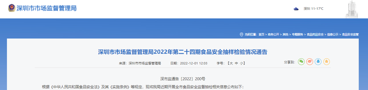 中國質(zhì)量新聞網(wǎng)訊 12月1日,深圳市市場監(jiān)督管理局網(wǎng)站發(fā)布2022年第二十四期食品安全抽樣檢驗情況。本次通報的抽檢信息共4076批次,涉及經(jīng)營主體1439家。