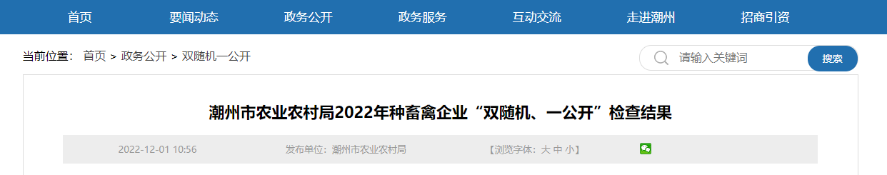 中國質(zhì)量新聞網(wǎng)訊 近日,廣東省潮州市農(nóng)業(yè)農(nóng)村局公布2022年種畜禽企業(yè)“雙隨機、一公開”檢查結(jié)果。