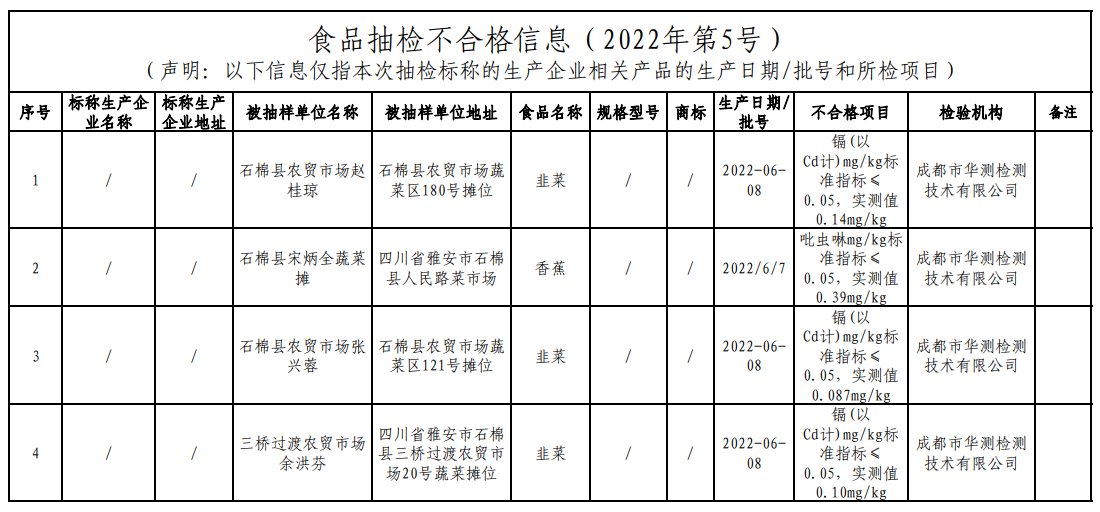 中國(guó)質(zhì)量新聞網(wǎng)訊 日前,四川省石棉縣市場(chǎng)監(jiān)督管理局發(fā)布2022年第5號(hào)食品安全監(jiān)督抽檢信息。本次收到100批次合格、4批次不合格食品信息。不合格食品涉及3批次韭菜、1批次香蕉。