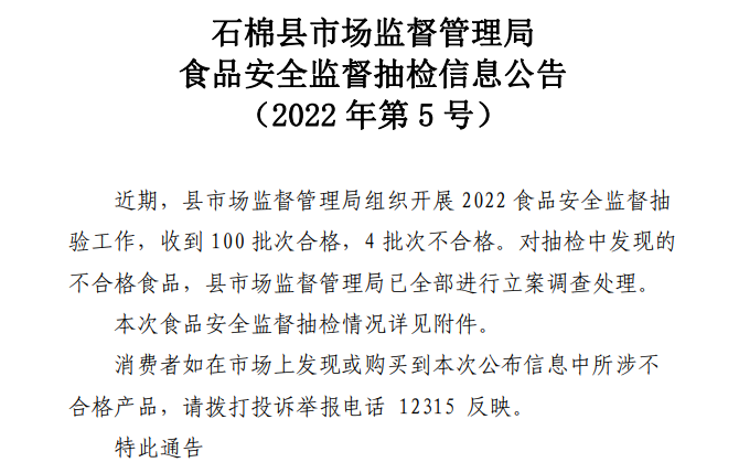 對(duì)抽檢中發(fā)現(xiàn)的不合格食品,縣市場(chǎng)監(jiān)督管理局已全部進(jìn)行立案調(diào)查處理。