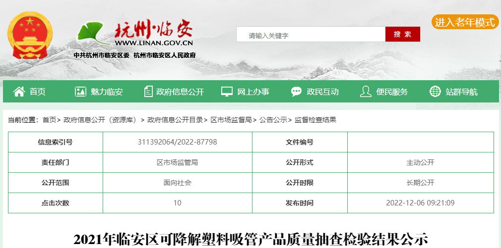 中國(guó)質(zhì)量新聞網(wǎng)訊 2022年12月6日,杭州市臨安區(qū)人民政府網(wǎng)站公示2021年可降解塑料吸管產(chǎn)品質(zhì)量抽查檢驗(yàn)結(jié)果。