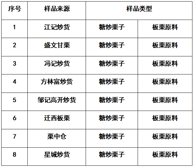 8批次生板栗未檢出石蠟,8批次糖炒栗子未檢出石蠟和五種甜味劑。