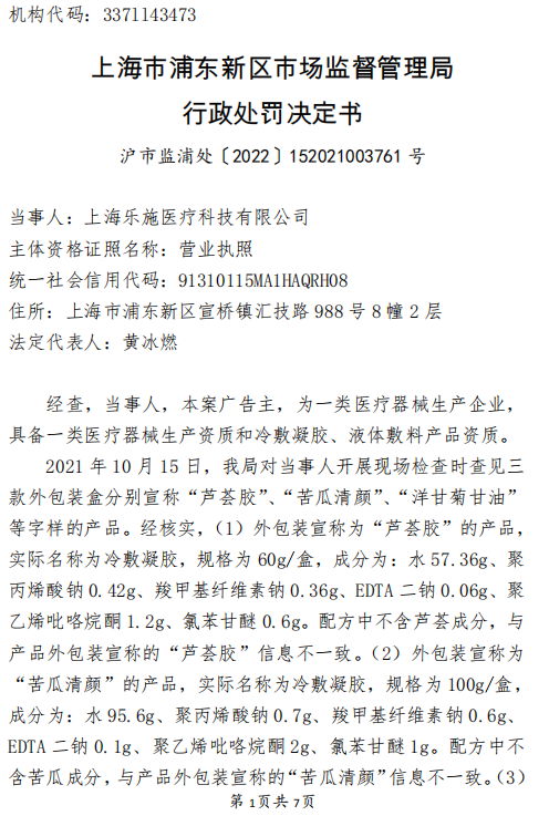 滬市監(jiān)浦處〔2022〕152021003761號(hào)處罰文書顯示,經(jīng)核實(shí),(1)外包裝宣稱為“蘆薈膠”的產(chǎn)品,其獨(dú)立的銷售包裝(規(guī)格為350白卡,以下簡稱:內(nèi)盒)中,共有2個(gè)展示面標(biāo)識(shí)了“蘆薈膠”字樣,使用字體均為:漢儀旗黑28pt,白色字,字體約為該產(chǎn)品實(shí)際名稱“冷敷凝膠”(實(shí)際名稱使用字體:漢儀旗黑12pt,白色字)的2.5倍大小,且“蘆薈膠”字樣在內(nèi)盒所有信息中字體最大,處于展示面中間位置,所占比例約為單個(gè)完整銷售包裝面積的18%,內(nèi)容顯著醒目。除內(nèi)盒以外,該產(chǎn)品使用“蘆薈膠”字樣的還有瓶標(biāo)(已直接印刷于每個(gè)直接接觸產(chǎn)品內(nèi)容物的塑料軟管上)、使用說明書(每一個(gè)內(nèi)盒中放置1張說明書)、中盒(規(guī)格為400g灰底白面,每1件中盒由12件內(nèi)盒組成)、外箱(規(guī)格為4層瓦楞裱灰底白面,每1件外箱由6件中盒組成)。上述包裝和說明材料中,“蘆薈膠”使用的均為頁面展示文字中的最大字號(hào),布局處于頁面中間顯著位置,所占同頁比例約為11.7%—18.7%不等。(2)外包裝宣稱為“苦瓜清顏”的產(chǎn)品,其獨(dú)立的銷售包裝(規(guī)格為350白卡,以下簡稱:內(nèi)盒)中,共有2個(gè)展示面標(biāo)識(shí)了“苦瓜清顏” 字樣,使用字體均為:漢儀旗黑23pt,白色字,字體約為該產(chǎn)品實(shí)際名稱“冷敷凝膠”(實(shí)際名稱使用字體:漢儀旗黑12pt,白色字)的2.5倍大小,且“蘆薈膠”字樣在內(nèi)盒所有信息中字體最大,處于展示面中間位置,所占比例約為單個(gè)完整銷售包裝面積的 22%,內(nèi)容顯著醒目。除內(nèi)盒以外,該產(chǎn)品使用“苦瓜清顏”字樣的還有瓶標(biāo)(已直接印刷于每個(gè)直接接觸產(chǎn)品內(nèi)容物的塑料瓶上)、使用說明書(每一個(gè)內(nèi)盒中放置 1 張說明書)、中盒(規(guī)格為 400g 灰底白面,每 1 件中盒由 12 件內(nèi)盒組成)、外箱(規(guī)格為 4 層瓦楞裱灰底白面,每 1 件外箱由 4 件中盒組成)。上述包裝和說明材料中,“苦瓜清顏”使用的均為頁面展示文字中的最大字號(hào),布局處于頁面中間顯著位置,所占同頁比例約為 14.7%—22%不等。(3)外包裝宣稱為“洋甘菊甘油”的產(chǎn)品,其獨(dú)立的銷售包裝(規(guī)格為 350 白卡,以下簡稱:內(nèi)盒)中,共有 2 個(gè)展示面標(biāo)識(shí)了“洋甘菊甘油”字樣,使用字體均為:漢儀旗黑 21pt,白色字,字體約為該產(chǎn)品實(shí)際名稱“冷液體敷料”(實(shí)際名稱使用字體:漢儀旗黑 14pt,白色字)的2.5倍大小,且“蘆薈膠”字樣在內(nèi)盒所有信息中字體最大,處于展示面中間位置,所占比例約為單個(gè)完整銷售包裝面積的18%,內(nèi)容顯著醒目。除內(nèi)盒以外,該產(chǎn)品使用“洋甘菊甘油”字樣的還有瓶標(biāo)(粘貼于每個(gè)直接接觸產(chǎn)品內(nèi)容物的塑料瓶上)、使用說明書(每一個(gè)內(nèi)盒中放置 1 張說明書)、中盒(規(guī)格為400g灰底白面,每1件中盒由12件內(nèi)盒組成)、外箱(規(guī)格為4層瓦楞裱灰底白面,每1件外箱由4件中盒組成)。上述包裝和說明材料中,“洋甘菊甘油”使用的均為頁面展示文字中的最大字號(hào),布局處于頁面中間顯著位置,所占同頁比例約為15.6%—18.5%不等。