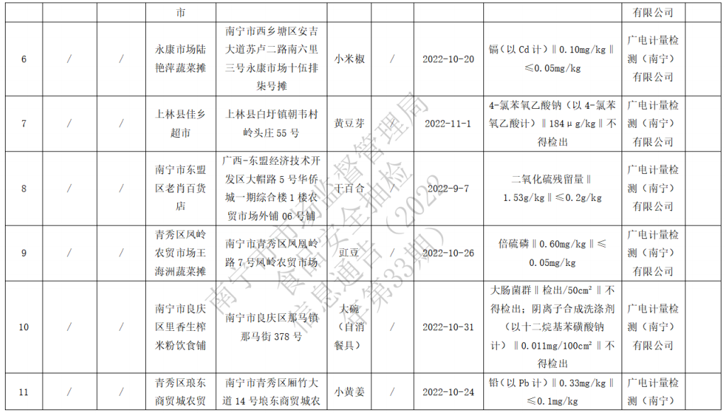 南寧市市場監(jiān)督管理局針對抽檢發(fā)現(xiàn)的問題,對于不合格樣品涉及的生產(chǎn)經(jīng)營單位,已要求屬地市場監(jiān)管部門對涉及單位依法處理,督促查清不合格產(chǎn)品的批次、數(shù)量、流向,召回不合格產(chǎn)品,采取下架等措施控制風險,分析原因進行整改,并依法予以查處。