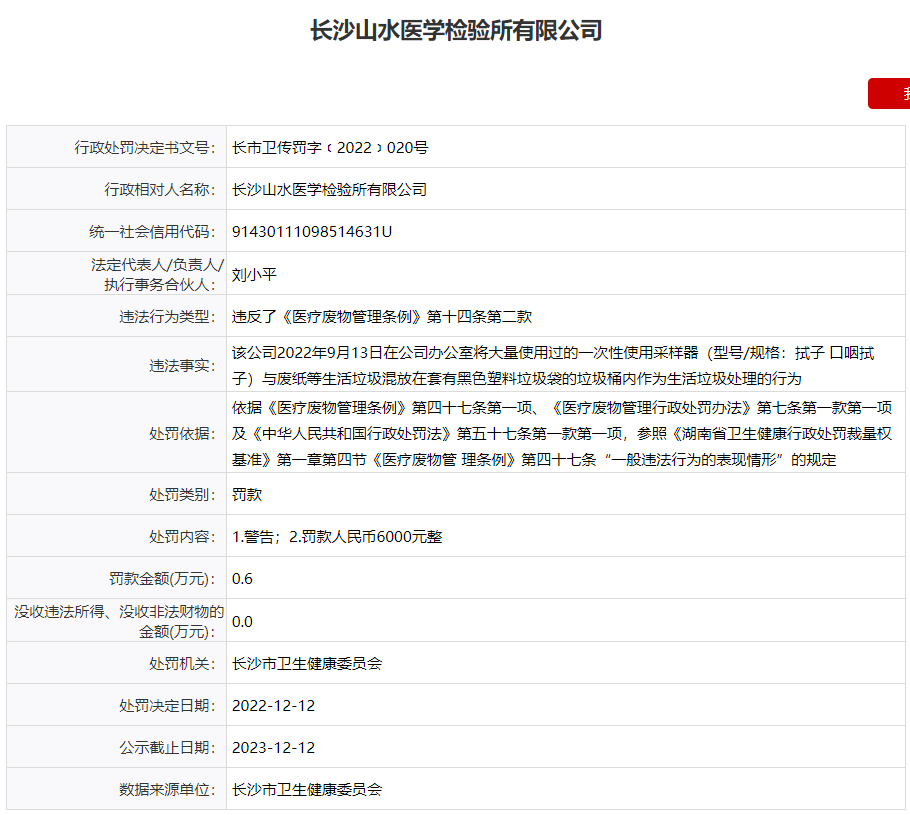 中國質(zhì)量新聞網(wǎng)訊(劉著之)信用中國(湖南長沙)顯示,12月12日,長沙山水醫(yī)學(xué)檢驗所有限公司違反《醫(yī)療廢物管理條例》,被罰款6000元。
