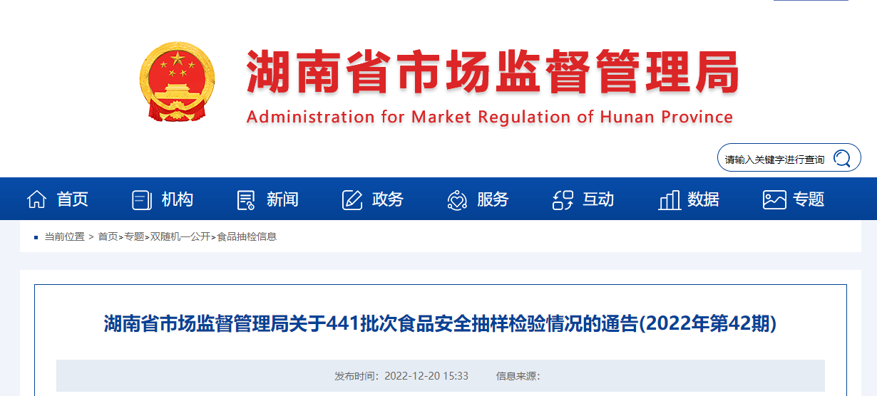 中國質量新聞網訊 12月20日,湖南省市場監(jiān)督管理局網站發(fā)布關于441批次食品安全抽樣檢驗情況的通告(2022年第42期)。本期抽檢肉制品、乳制品、蛋制品、糕點等27大類食品441批次樣品。根據(jù)食品相關標準檢驗和判定,435批次樣品合格,6批次樣品不合格。