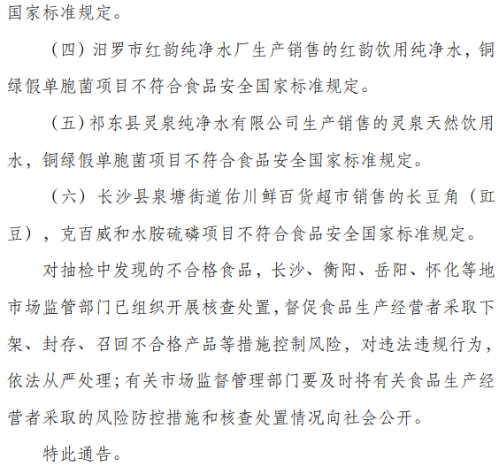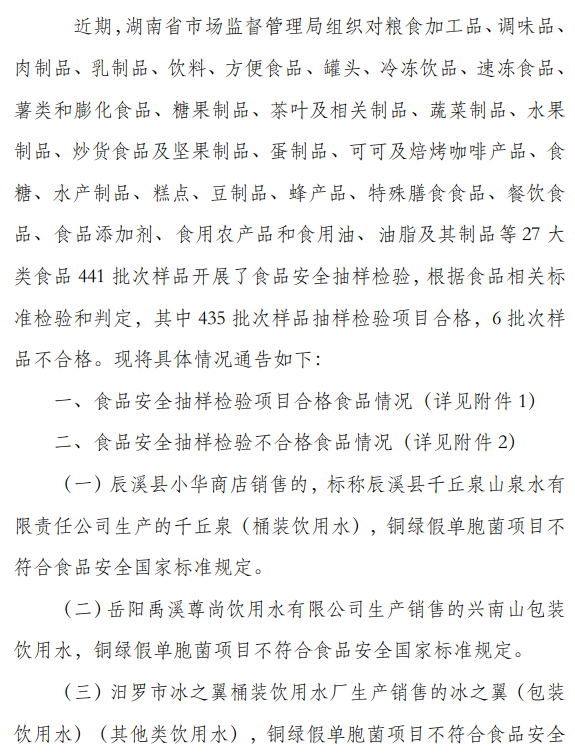 不合格樣品涉及辰溪縣千丘泉山泉水有限責任公司、岳陽禹溪尊尚飲用水有限公司、汨羅市冰之翼桶裝飲用水廠、汨羅市紅韻純凈水廠、祁東縣靈泉純凈水有限公司等標稱生產企業(yè)。