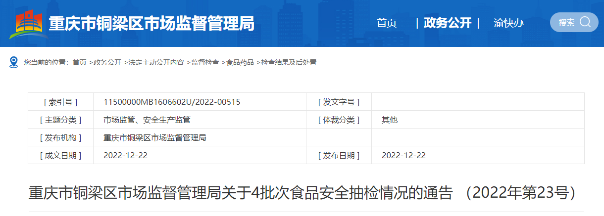 中國質(zhì)量新聞網(wǎng)訊 12月22日,重慶市銅梁區(qū)市場(chǎng)監(jiān)督管理局發(fā)布關(guān)于4批次食品安全抽檢情況的通告(2022年第23號(hào))。通告稱,近期,該局組織抽檢食用農(nóng)產(chǎn)品、餐飲食品、餅干等3類食品4批次樣品,均不合格。根據(jù)食品安全國家標(biāo)準(zhǔn),個(gè)別項(xiàng)目不合格,其產(chǎn)品即判定為不合格產(chǎn)品。