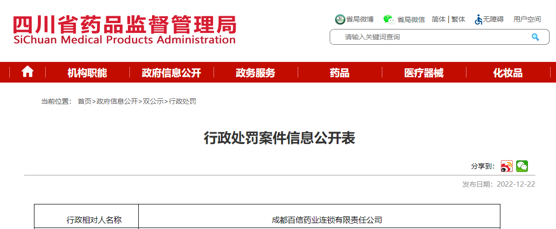 中國質(zhì)量新聞網(wǎng)訊 12月22日,四川省藥品監(jiān)督管理局網(wǎng)站公開行政處罰案件信息(川藥監(jiān)罰決〔2022〕1010號),涉及成都百信藥業(yè)連鎖有限責(zé)任公司。