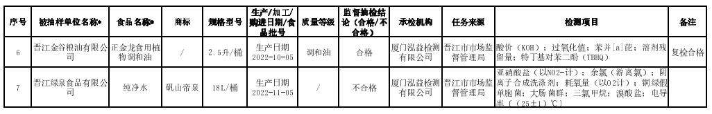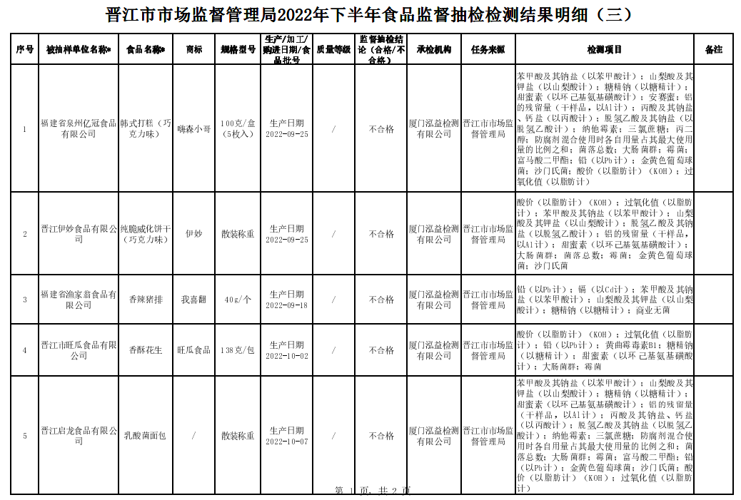 中國(guó)質(zhì)量新聞網(wǎng)訊 12月22日,福建省晉江市市場(chǎng)監(jiān)管局網(wǎng)站發(fā)布2022年下半年食品監(jiān)督抽檢檢測(cè)結(jié)果(三)。本次抽檢涉及7批次食品,其中6批次不合格。