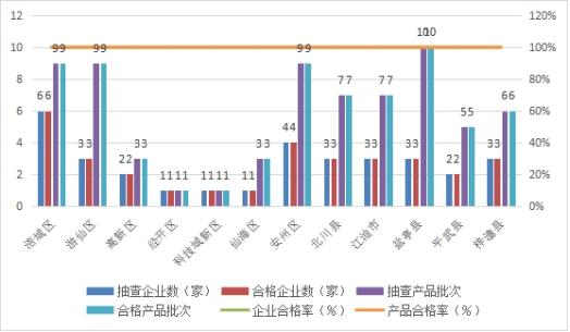 本次抽查工作涉及綿陽(yáng)市轄區(qū)12個(gè)區(qū)域,按企業(yè)所在地統(tǒng)計(jì)企業(yè)和產(chǎn)品的合格率,如表1和圖2所示。