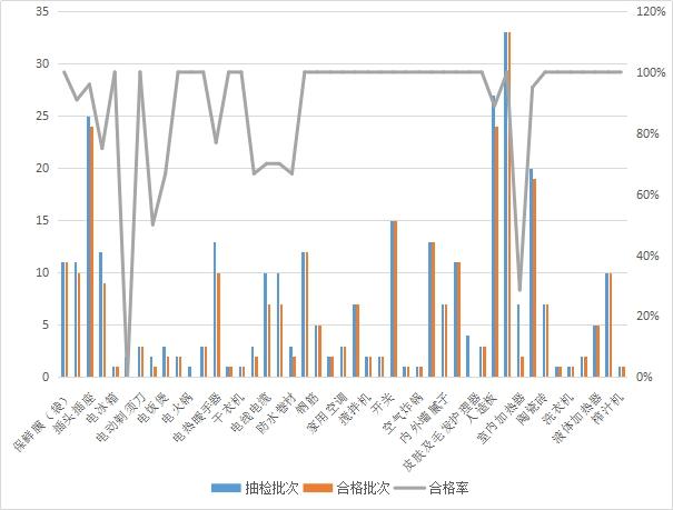 音箱抽檢1批次,合格1批次,合格率為100%;電視機抽檢1批次,合格1批次,合格率為100%;保鮮膜(袋)抽檢10批次,合格10批次,合格率為100%;餐具洗滌劑抽檢3批次,合格3批次,合格率為100%;插頭插座抽檢7批次,合格7批次,合格率為100%;電線電纜抽檢10批次,合格10批次,合格率為100%;防水涂料抽檢2批次,合格2批次,合格率為100%;鋼筋抽檢3批次,合格3批次,合格率為100%;家具抽檢6批次,合格6批次,合格率為100%;家用空調抽檢1批次,合格1批次,合格率為100%;建筑用玻璃抽檢3批次,合格3批次,合格率為100%;膠粘劑抽檢1批次,合格1批次,合格率為100%;內外墻膩子抽檢3批次,合格3批次,合格率為100%;內外墻涂料抽檢3批次,合格3批次,合格率為100%;人造板抽檢3批次,合格3批次,合格率為100%;食品接觸用塑料包裝容器抽檢6批次,合格6批次,合格率為100%;水泥抽檢8批次,合格8批次,合格率為100%;塑料管材管件抽檢10批次,合格9批次,合格率為90%。各類產品抽檢批次,合格批次及合格率如表1、圖2所示。