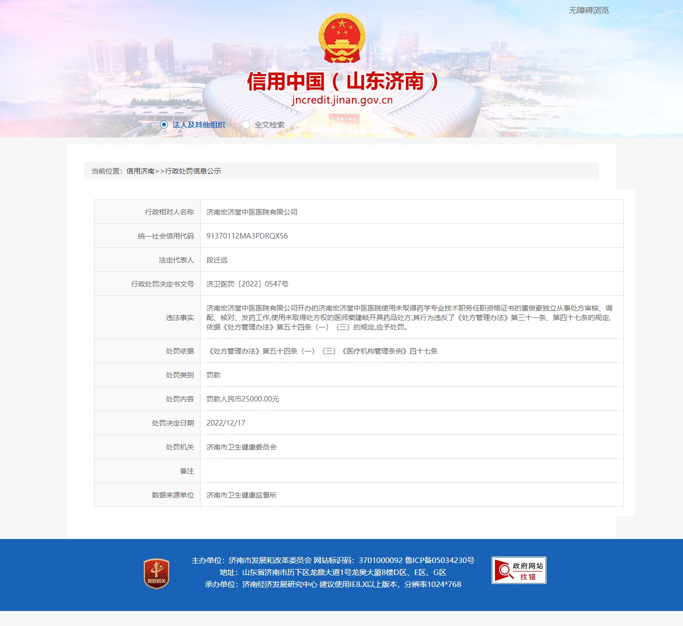 濟(jì)南宏濟(jì)堂中醫(yī)醫(yī)院使用未取得藥學(xué)專業(yè)技術(shù)職務(wù)任職資格證書的董俊豪獨(dú)立從事處方審核、調(diào)配、核對(duì)、發(fā)藥工作,使用未取得處方權(quán)的醫(yī)師竇建岐開具藥品處方,違反《處方管理辦法》,被濟(jì)南市衛(wèi)生健康委員會(huì)罰款25000元。