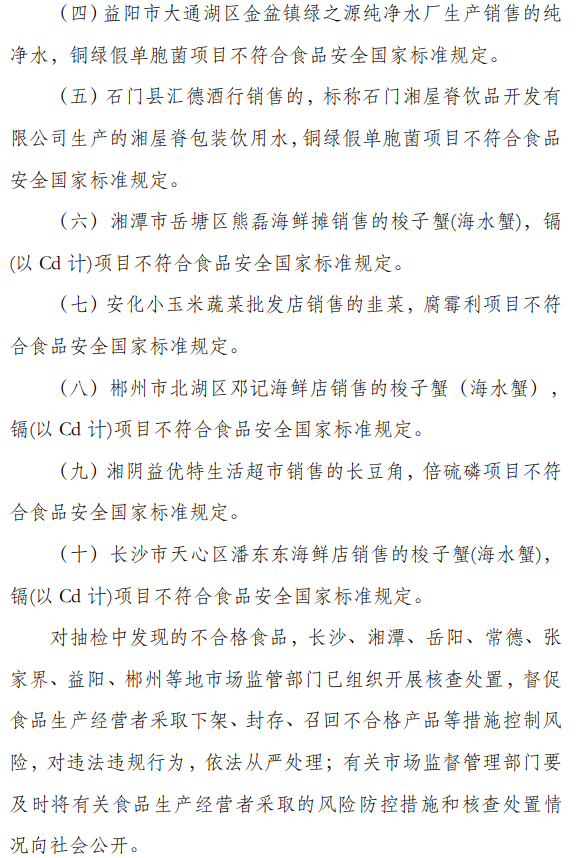 不合格樣品涉及飲用水、梭子蟹(海水蟹)、韭菜、長豆角等,涉及澧縣愛可娜飲用水有限公司、張家界雙盛食品飲料有限責(zé)任公司、石門湘屋脊飲品開發(fā)有限公司等標(biāo)稱生產(chǎn)企業(yè)。