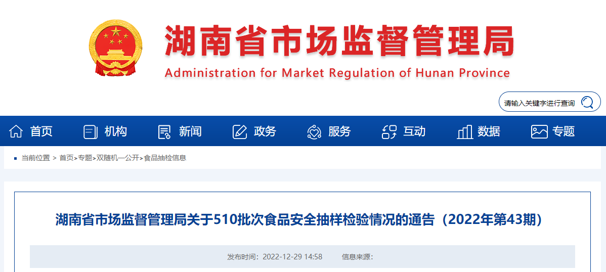 中國質(zhì)量新聞網(wǎng)訊 12月29日,湖南省市場監(jiān)督管理局網(wǎng)站發(fā)布關(guān)于510批次食品安全抽樣檢驗情況的通告(2022年第43期)。本期抽檢蔬菜制品、蜂產(chǎn)品、特殊膳食食品、食品添加劑等18大類食品510批次樣品。根據(jù)食品相關(guān)標(biāo)準(zhǔn)檢驗和判定,500批次樣品合格、10批次樣品不合格。