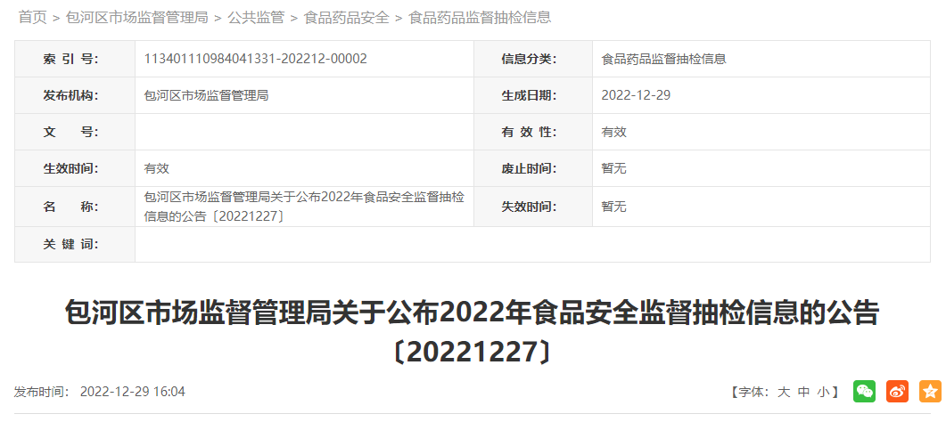 | NCP22340111344555277 | 41 | / | / | 合肥市包河區(qū)好鮮笙百貨超市 | 安徽 | 大白菜 | / | 2022-10-19 | 食用農(nóng)產(chǎn)品 | 合肥市包河區(qū)市場(chǎng)監(jiān)督管理局 | |||