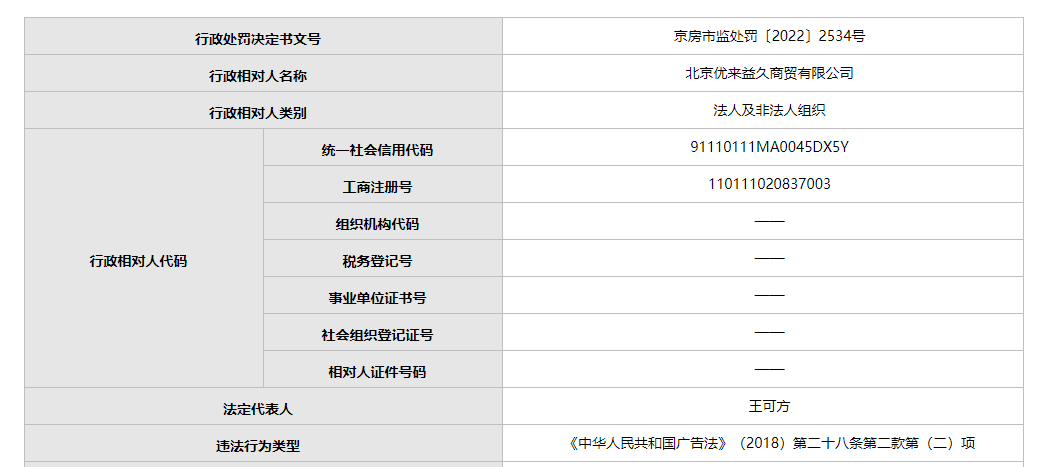 京房市監(jiān)處罰〔2022〕2534號(hào)顯示,當(dāng)事人發(fā)布的商品廣告有效期限與商品實(shí)際情況不符,涉嫌發(fā)布虛假廣告。北京市房山區(qū)市場(chǎng)監(jiān)督管理局認(rèn)為,當(dāng)事人違反了《中華人民共和國廣告法》(2018)第二十八條第二款第(二)項(xiàng),依據(jù)《中華人民共和國廣告法》(2018)第五十五條第一款,對(duì)當(dāng)事人罰款2280元并責(zé)令其改正上述違法行為。