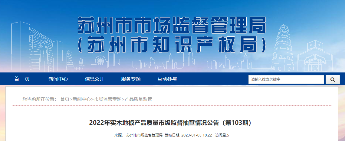 中國質(zhì)量新聞網(wǎng)訊 2023年1月3日,江蘇省蘇州市市場監(jiān)督管理局網(wǎng)站發(fā)布2022年實木地板產(chǎn)品質(zhì)量市級監(jiān)督抽查情況公告(第103期)。