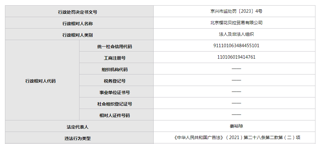 中國(guó)質(zhì)量新聞網(wǎng)訊(閆冬)北京市市場(chǎng)監(jiān)督管理局網(wǎng)站近日公開(kāi)一則行政處罰決定書。北京櫻花貝拉貿(mào)易有限公司因違反《中華人民共和國(guó)廣告法》相關(guān)規(guī)定被市場(chǎng)監(jiān)管部門處罰。