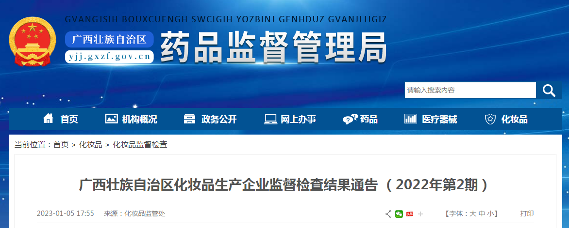 中國質(zhì)量新聞網(wǎng)訊 2023年1月5日,廣西壯族自治區(qū)藥品監(jiān)督管理局網(wǎng)站公布化妝品生產(chǎn)企業(yè)監(jiān)督檢查結(jié)果(2022年第2期)。本期檢查桂平華寶健康科技有限公司、廣西佳恒化妝品有限公司、金雞藥業(yè)股份有限公司、柳州兩面針股份有限公司等40家化妝品生產(chǎn)企業(yè)。