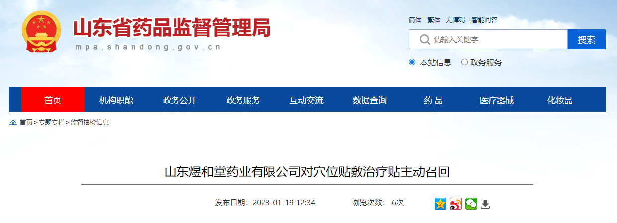 中國(guó)質(zhì)量新聞網(wǎng)訊 據(jù)山東省藥監(jiān)局網(wǎng)站2023年1月19日消息,山東煜和堂藥業(yè)有限公司報(bào)告,由于產(chǎn)品檢出水楊酸甲酯等原因,山東煜和堂藥業(yè)有限公司對(duì)其生產(chǎn)的穴位貼敷治療貼(注冊(cè)證號(hào):魯械注準(zhǔn)20152090312)主動(dòng)召回。召回級(jí)別為三級(jí)。