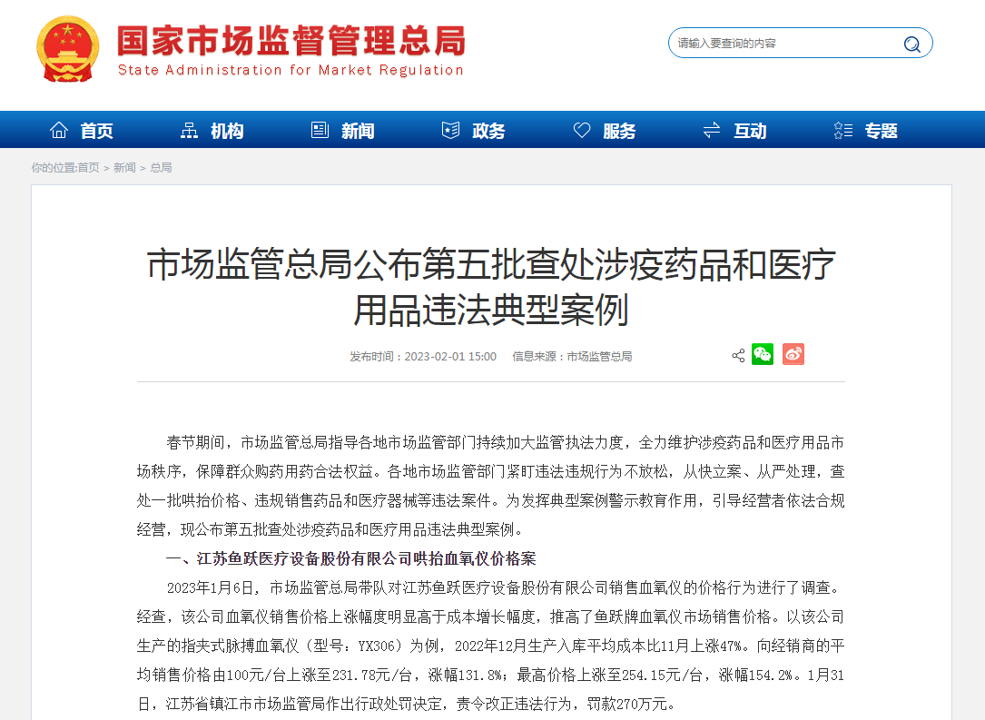 2月1日下午,在市場監(jiān)管總局公布的第五批查處涉疫藥品和醫(yī)療用品違法典型案例中,第一個案例即為江蘇魚躍醫(yī)療設(shè)備股份有限公司哄抬血氧儀價格案。