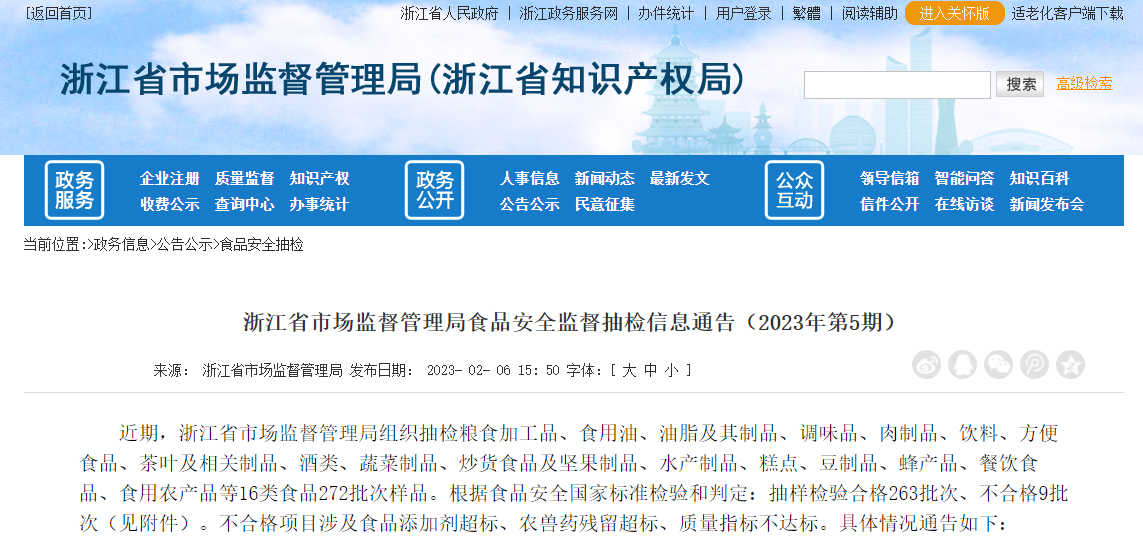 中國質(zhì)量新聞網(wǎng)訊 2023年2月6日,浙江省市場監(jiān)督管理局網(wǎng)站發(fā)布2023年第5期食品安全監(jiān)督抽檢信息。本期抽檢糧食加工品、餐飲食品、食用農(nóng)產(chǎn)品等16類食品272批次樣品。根據(jù)食品安全國家標(biāo)準(zhǔn)檢驗(yàn)和判定:抽樣檢驗(yàn)合格263批次、不合格9批次。合格產(chǎn)品信息見下表。
