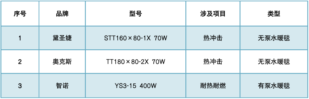 本次樣品中,水暖毯在電氣安全方面存在的問題更多。18款樣品中有3款在耐熱耐燃、熱沖擊試驗中不符合國家相關(guān)標準要求,存在一定的電氣安全隱患,因此不參與本次比較試驗的綜合評價打分。