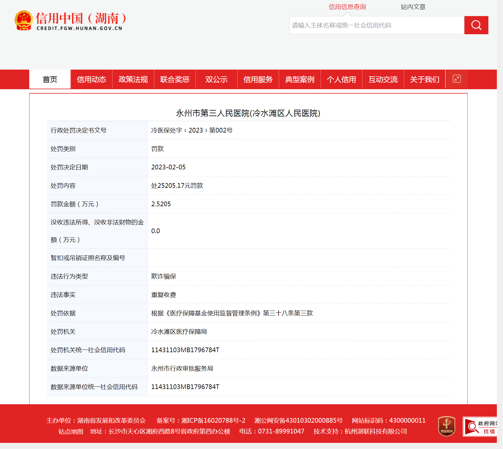 中國(guó)質(zhì)量新聞網(wǎng)訊近日,信用中國(guó)(湖南)發(fā)布的一則行政處罰信息顯示,永州市第三人民醫(yī)院(冷水灘區(qū)人民醫(yī)院)存在重復(fù)收費(fèi)行為,違法行為類型為“欺詐騙?!薄@渌疄﹨^(qū)醫(yī)療保障局依據(jù)《醫(yī)療保障基金使用監(jiān)督管理?xiàng)l例》第三十八條第三款規(guī)定,對(duì)永州市第三人民醫(yī)院(冷水灘區(qū)人民醫(yī)院)予以行政處罰,罰款25205.17元。