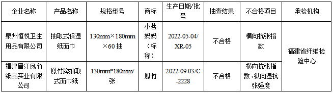 不合格樣品包括泉州恒悅衛(wèi)生用品有限公司的1批次抽取式保濕紙面巾、福建晉江鳳竹紙品實業(yè)有限公司的1批次抽取式面巾紙。