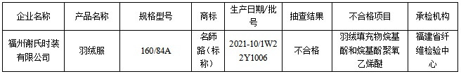 信息顯示,福州謝氏時(shí)裝有限公司的1批次羽絨服被檢出不合格。