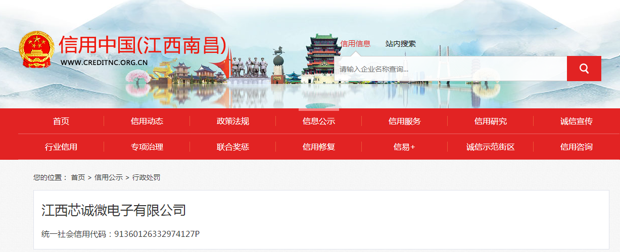 中國(guó)質(zhì)量新聞網(wǎng)訊 據(jù)信用中國(guó)(江西南昌)網(wǎng)站消息,近日,江西贛江新區(qū)消防救援大隊(duì)對(duì)江西芯誠(chéng)微電子有限公司作出行政處罰:罰款14000元。