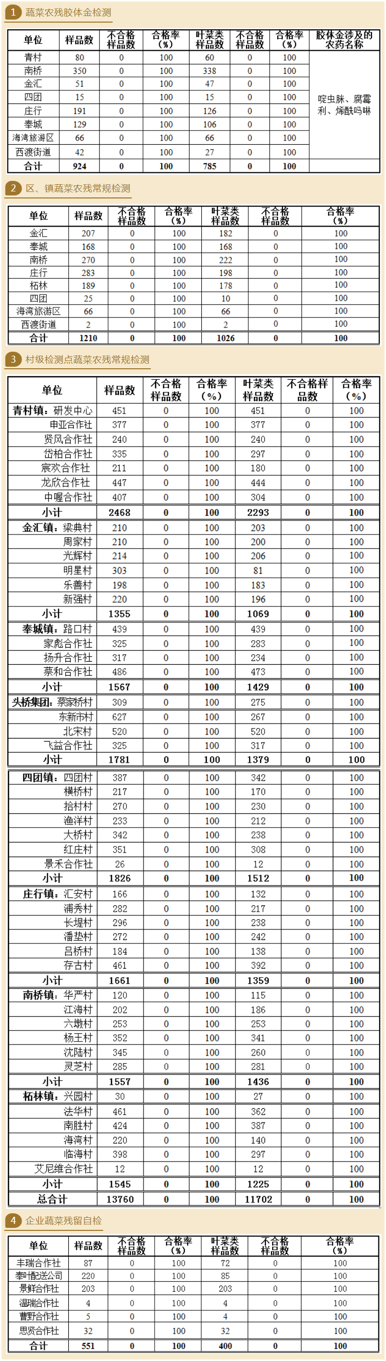 本月全區(qū)膠體金檢測蔬菜樣品924份,其中葉菜類樣品785份;常規(guī)檢測蔬菜樣品15521份,其中葉菜類樣品為13128份,合格率100%。