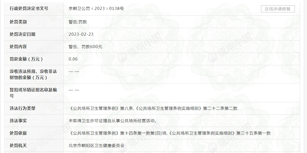 京朝衛(wèi)公罰﹝2023﹞0138號顯示,北京呂營潔雅洗澡部違法事實為“未取得衛(wèi)生許可證擅自從事公共場所經(jīng)營活動”。違法行為類型為:《公共場所衛(wèi)生管理條例》第八條,《公共場所衛(wèi)生管理條例實施細則》第二十二條第二款。