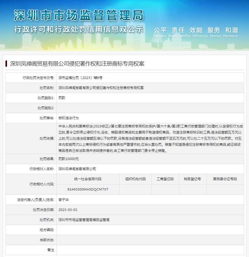 中國質(zhì)量新聞網(wǎng)訊 近日,深圳市市場監(jiān)督管理局福田監(jiān)管局發(fā)布行政處罰決定書(深市監(jiān)福處罰〔2023〕稽8號),涉及深圳鳳禪閣貿(mào)易有限公司侵犯著作權(quán)和注冊商標(biāo)專用權(quán)案。