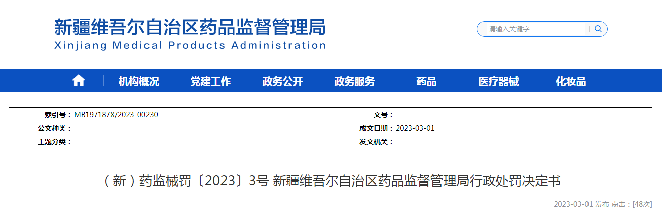 (新)藥監(jiān)械罰〔2023〕3號 新疆維吾爾自治區(qū)藥品監(jiān)督管理局行政處罰決定書.pdf