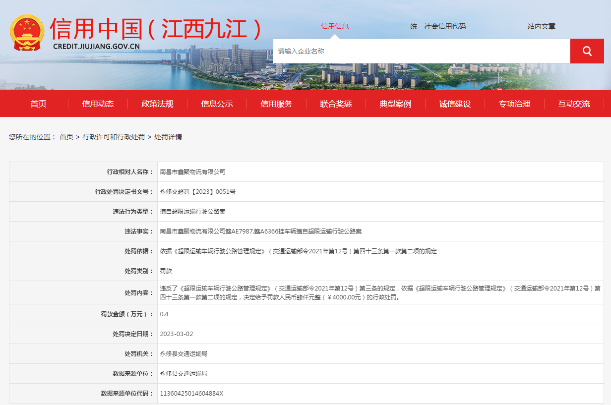 中國質(zhì)量新聞網(wǎng)訊 據(jù)信用中國(江西九江)網(wǎng)站消息,近日,江西省永修縣交通運輸局對南昌市鑫聚物流有限公司作出行政處罰:罰款4000元。行政處罰決定書文號:永修交超罰【2023】0051號。