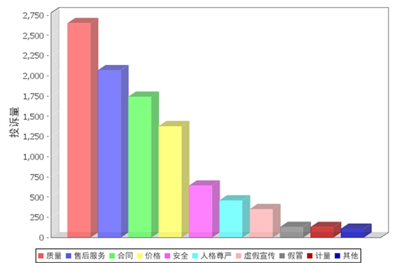 (一)根據(jù)投訴性質(zhì)分析:質(zhì)量2651件,占投訴總量的27.45%;售后服務(wù)2069件,占投訴總量的21.42%;合同1741件,占投訴總量的18.02%;價(jià)格1377件,占投訴總量的14.26%;安全642件,占投訴總量的6.65%;人格尊嚴(yán)459件,占投訴總量的4.75%;虛假宣傳351件,占投訴總量的3.63%;假冒131件,占投訴總量的1.36%;計(jì)量130件,占投訴總量的1.35%;其他108件,占投訴總量的1.12%;其中,質(zhì)量、售后服務(wù)、合同、價(jià)格、安全占據(jù)了消費(fèi)者投訴的前5名。(見(jiàn)圖一)