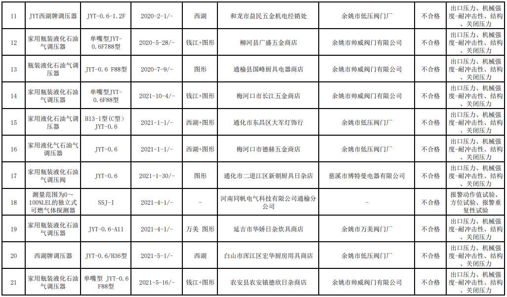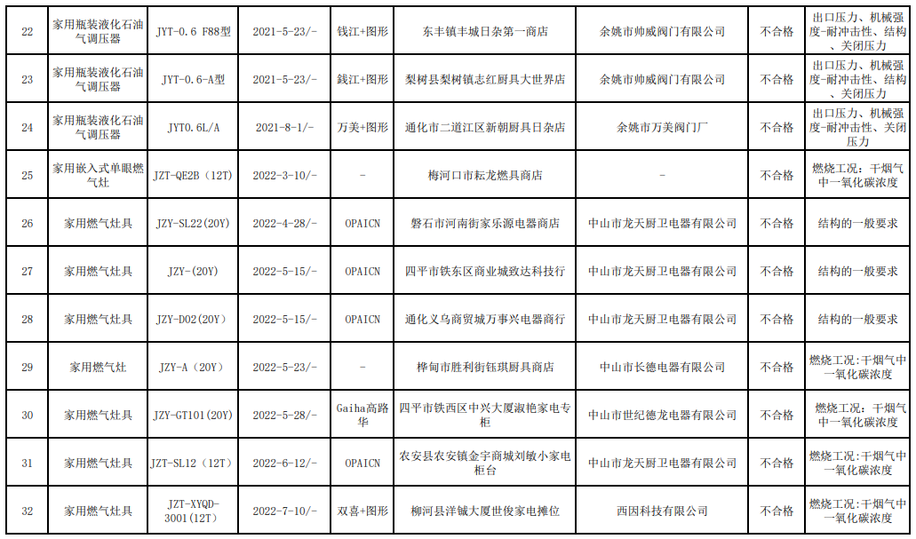 不合格產(chǎn)品涉及慈溪市博特曼電器有限公司、寧波璐美燃氣具閥門有限公司、余姚市帥威閥門有限公司、中山市龍?zhí)鞆N衛(wèi)電器有限公司、中山市長德電器有限公司、中山市世紀德龍電器有限公司、西因科技有限公司、慈溪銳溪閥門有限公司等標稱生產(chǎn)單位。